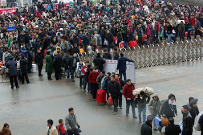 Multitudes of travelers on the square wait to get into the railway station in Guiyang, capital of southwest China's Guizhou Province, Jan. 27, 2008. Some electric trains were delayed after snow and ice damaged overhead power lines a couple of days ago. The railway administrative department is working hard to repair the damaged power lines