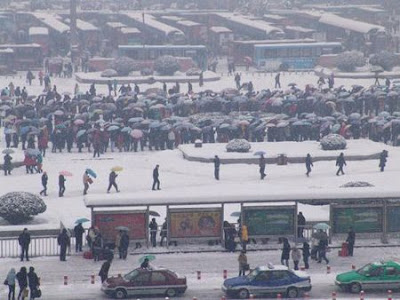 People walk in snow in Zhengzhou, capital of central China's Henan Province, Jan. 27, 2008. The provincial meteorological observatory issued a yellow warning sign about heavy snow on Sunday