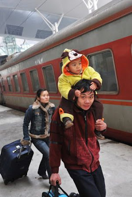 A soldier helps a little girl at Guangzhou's railway station in south China's Guangdong Province.