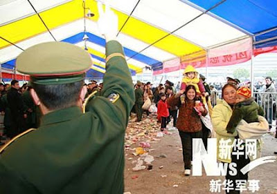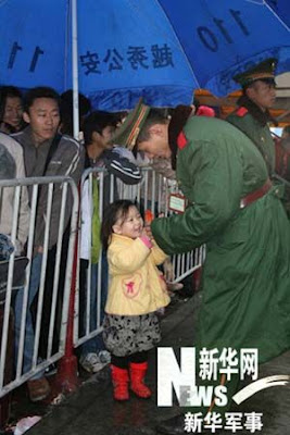 Two soldiers carry a sick girl to a medical aid post in Guangzhou, the capital city of south China's Guangdong Province.