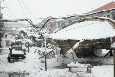 Photo taken on Jan. 26 shows the collapsed market shanty in Chaohu, east China's Anhui Province. A 3000-square-meter market of farm products was weighed down by heavy snow Saturday, with 8 people trapped in ruins. All of stucked victims were rescued several hours later
