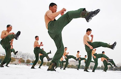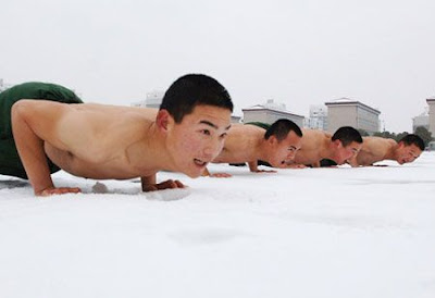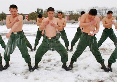 Stripped to the waist, armed police officers take exercise against the skin piercing wind in Hefei, capital of South China's Anhui Province, Jan. 21, 2008.