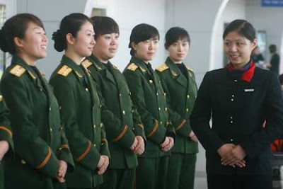 A soldier guides femal passengers carrying their children to the platform in advance at the railway station in Guangzhou, the capital city of south China's Guangdong Province.