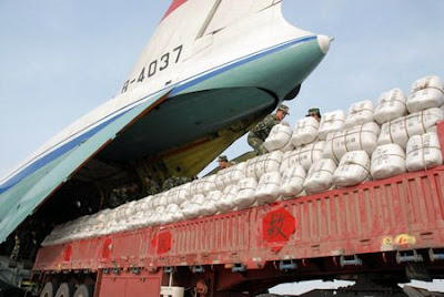 Winter clothes and other disaster-relief stuff are boarded onto a jet plane of the Chinese air forces in Xianyang, Shaanxi Province, before they are transported to snowstorm-affected regions in Southwest China's Guizhou Province, Jan. 31,