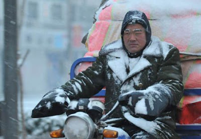 A man rides on a tricycle in Zhengzhou, capital of central China's Henan Province, Jan. 27, 2008. The provincial meteorological observatory issued a yellow warning sign about heavy snow on Sunday