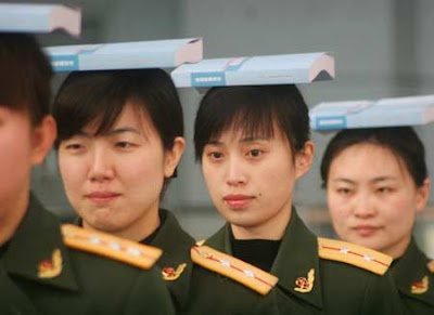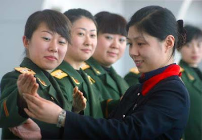 Female entry-exit inspectors receive gesture training from an etiquette coach at frontier inspection station of Shenyang, capital of northeast China's Liaoning Province, Jan. 21, 2008.
