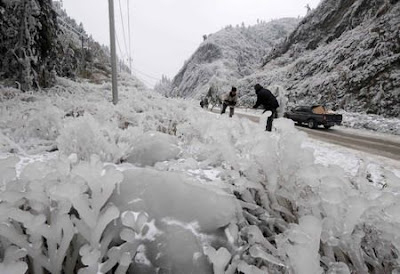 Workers clear ice on a closed section of an inter-provincial road in Ziyuan, Southwest China's Guangxi Zhuang Autonomous Region, Jan. 31, 2008.