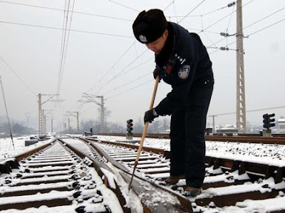 A police officer cleans ice and snow on railway track in Southwest Chian's Chongqing Municipality Jan. 31, 2008.