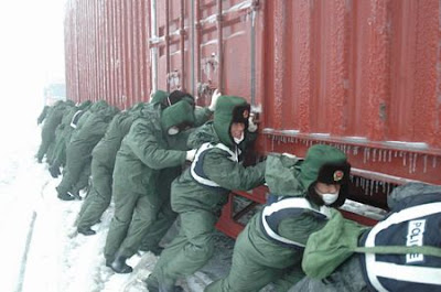 Soldiers push a container truck stranded on a snow-plagued stretch of the Beijing-Zhuhai Expressway in Shaoguan, South China's Guangdong Province, Jan. 31, 2008.