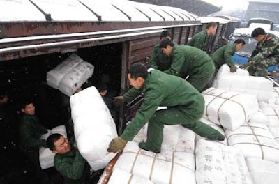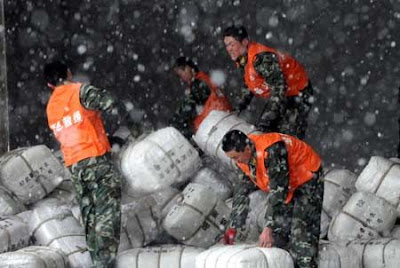 Soldiers of the armed police force carry disaster-relief resources in Wuhan, capital of central China's Hubei Province, Feb. 1, 2008. Some 120,000 clothes and quilts were sent to people suffering from severe snowstorm and frost in Hubei province on Friday.