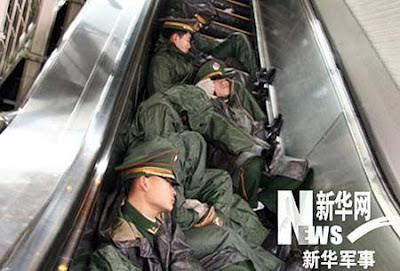 Exhausted soldiers sleep on an escalator at the railway station in Guangzhou, the capital city of south China's Guangdong Province.