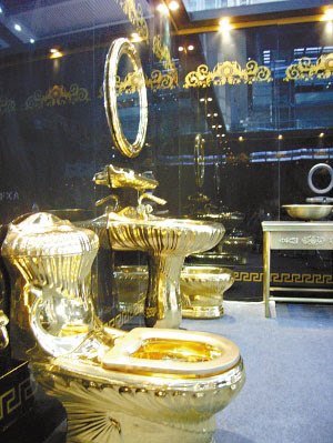 This 18K Gold Toilet was exhibited in Guangdong Province Shenzhen Expo Center on January 18, 2008. It was introduce that this Gold Toilet was one of 200 items for a "luxury staff exhibition". The demonstration totally displayed 200 items with value of billions of RMB, including Hennessy XO~MAGNIFICENCE, C8 Spyder, 130 million Golf vela(model displayed). This gold toilet was once sold in Beijing in 1.8 million RMB.
