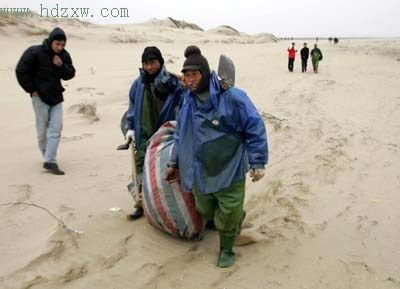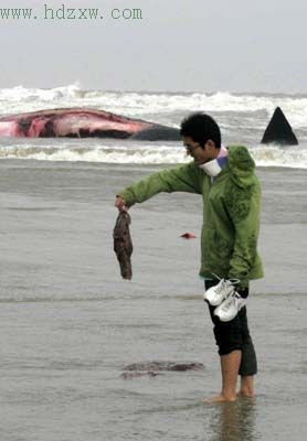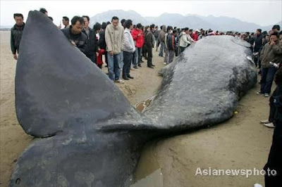 The body of a giant sperm whale is seen on a beach near Songxia Port in Changle, East China's Fujian Province Jan. 15, 2008. The giant sperm whale which is measured 16 meters in length, 8.6 meters in diameter and weighed 20 tons, died after becoming stranded on a southeastern China beach Tuesday