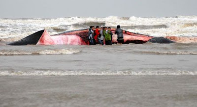 A giant sperm whale died in Southeastern China beach, its meat carved up by local people