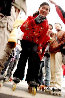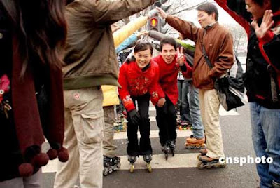 A new married couple were wearing roller skating shoes for celebrating their wedding ceremony. They also invited 20 Peking University schoolmates